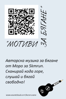 Специално за този лайф бях събрал повечето свои инструментали в един плейлист – „Мотиви за бягане„, който е качен на моят профил в Soundcloud. Извадих един QR code с линка, направих флаери с него и го раздадох на хората на състезанието, които обичат тичат с музика. Разбира се, и аз тичах един път с него предварително, да опитам все пак дали става за бягане, или те кара на лягане. 🙂